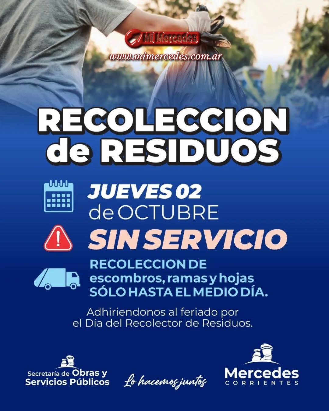 La Secretaría de Obras y Servicios Públicos de Mercedes informa que, con motivo del feriado por el Día del Recolector de Residuos, este jueves 2 de octubre no habrá servicio de recolección domiciliaria.